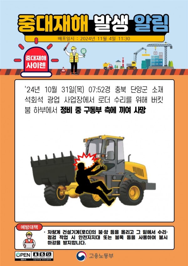 석회석 광업 사업장에서 로더 정비 중 구동부 측에 끼여 사망 페이지 정보 작성자 안전경영컨설팅 작성일24-11-11 08:45 조회3,268회 댓글0건 관련링크 이전글 다음글 목록 본문 . 댓글목록 등록된 댓글이 없습니다. 이전글 다음글 목록