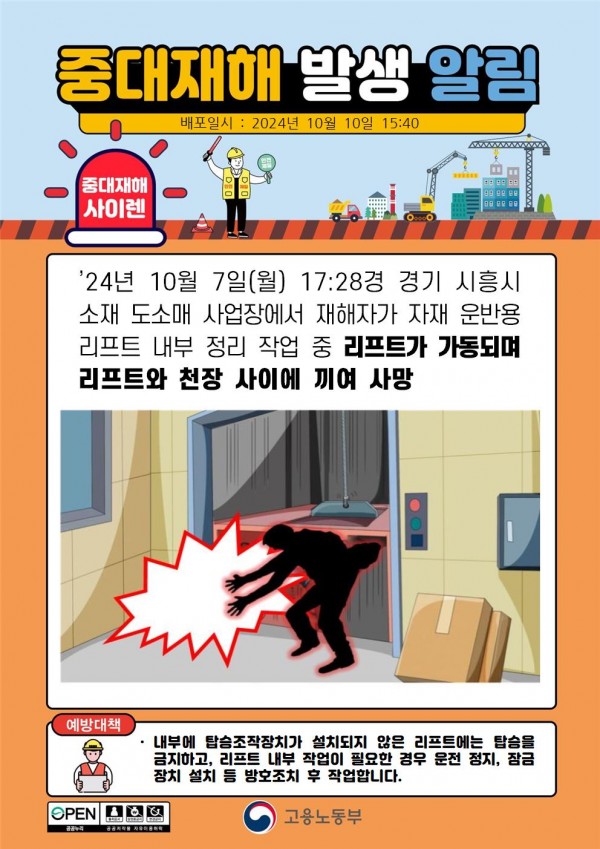 도소매 사업장에서 리프트와 천장 사이에 끼여 사망 페이지 정보 작성자 안전경영컨설팅 작성일24-11-11 08:45 조회2,664회 댓글0건 관련링크 이전글 다음글 목록 본문 . 댓글목록 등록된 댓글이 없습니다. 이전글 다음글 목록