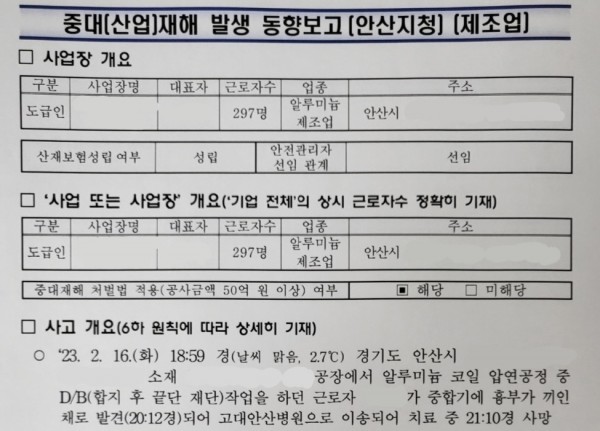 <중대재해> 알루미늄 코일 압연 공정 끼임 재해 페이지 정보 작성자 안전경영컨설팅 작성일23-03-28 09:04 조회5,046회 댓글0건 관련링크 이전글 다음글 목록 본문 . 댓글목록 등록된 댓글이 없습니다. 이전글 다음글 목록