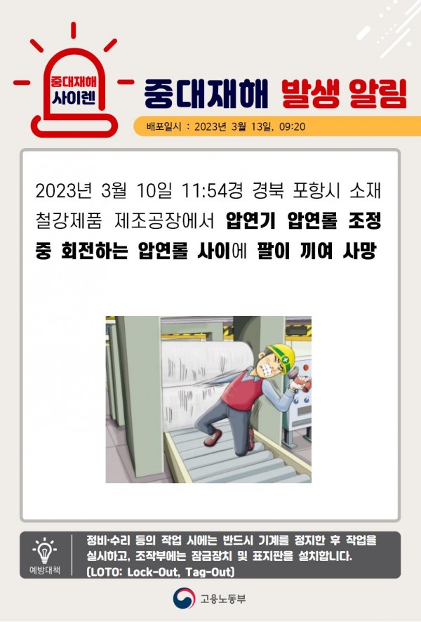 <중대재해> 철강제품 제조업 압연롤 끼임 재해 페이지 정보 작성자 안전경영컨설팅 작성일23-03-28 09:05 조회5,243회 댓글0건 관련링크 이전글 다음글 목록 본문 . 댓글목록 등록된 댓글이 없습니다. 이전글 다음글 목록