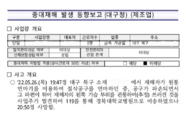 <중대재해> 원통 연마기 절삭 공구 가공 중 파편에 맞음 페이지 정보 작성자 안전경영컨설팅 작성일22-06-07 10:27 조회5,300회 댓글0건 관련링크 이전글 다음글 목록 본문 . 댓글목록 등록된 댓글이 없습니다. 이전글 다음글 목록