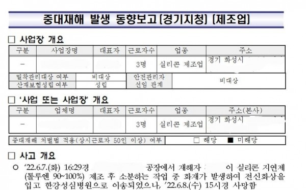 <중대재해>실리콘 지연제 소분 작업중 화재 페이지 정보 작성자 안전경영컨설팅 작성일22-07-14 09:11 조회5,112회 댓글0건 관련링크 이전글 다음글 목록 본문 . 댓글목록 등록된 댓글이 없습니다. 이전글 다음글 목록