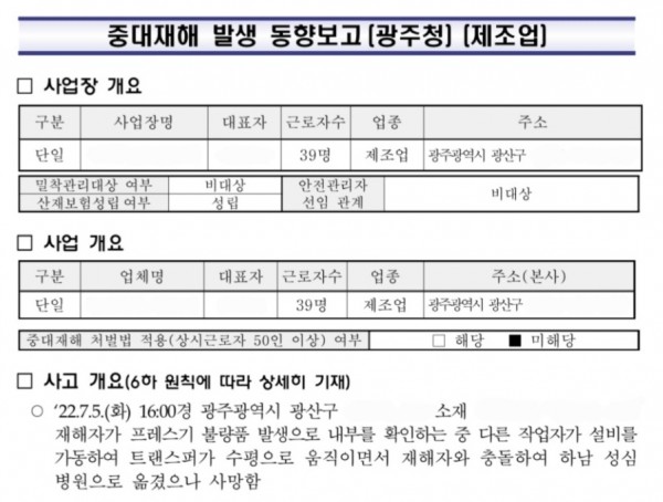 <중대재해> 프레스 점검 작업 중 타 근로자 작동으로 인한 끼임 페이지 정보 작성자 안전경영컨설팅 작성일22-07-14 09:14 조회5,501회 댓글0건 관련링크 이전글 다음글 목록 본문 . 댓글목록 등록된 댓글이 없습니다. 이전글 다음글 목록