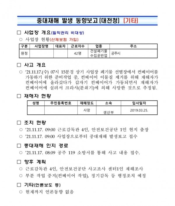 <중대재해> 폐기물 사업장 컨베이어 끼임 사망 사고
