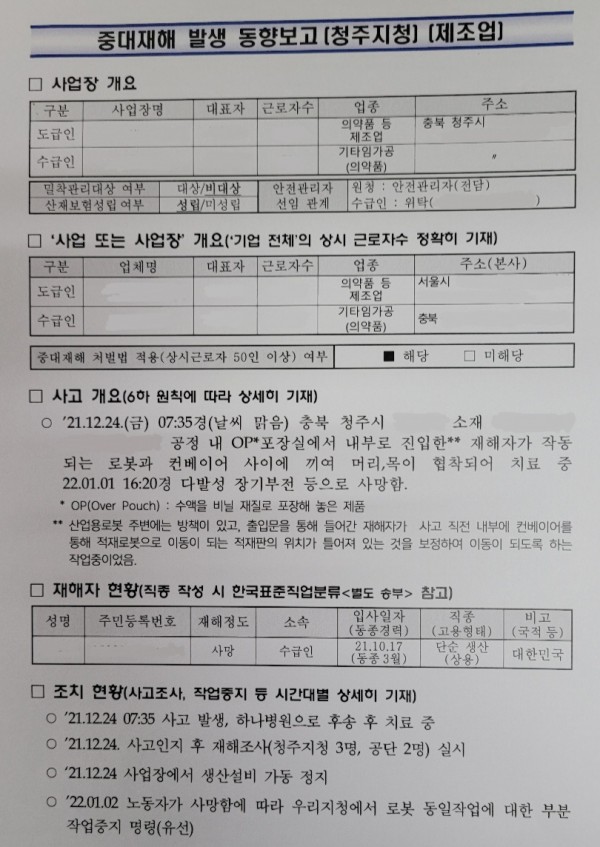 <중대재해> 산업용로봇 , 컨베이어 사이 끼임으로 인한 재해