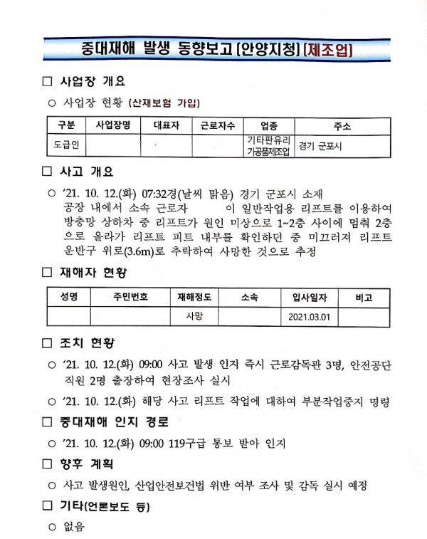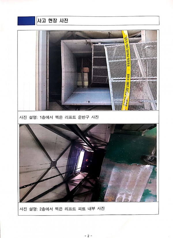 <중대재해>일반작업용 리프트 피트 확인 중 추락