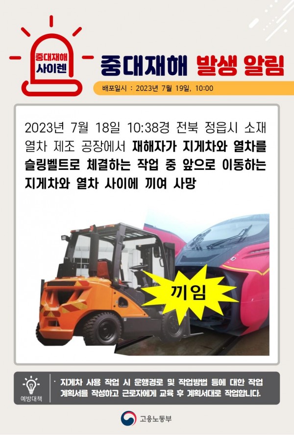 <중대재해>지게차와 열차 슬링벨트 체결 중 끼임사망 페이지 정보 작성자 안전경영컨설팅 작성일23-08-31 16:39 조회5,206회 댓글0건 관련링크 이전글 다음글 목록 본문 . 댓글목록 등록된 댓글이 없습니다. 이전글 다음글 목록