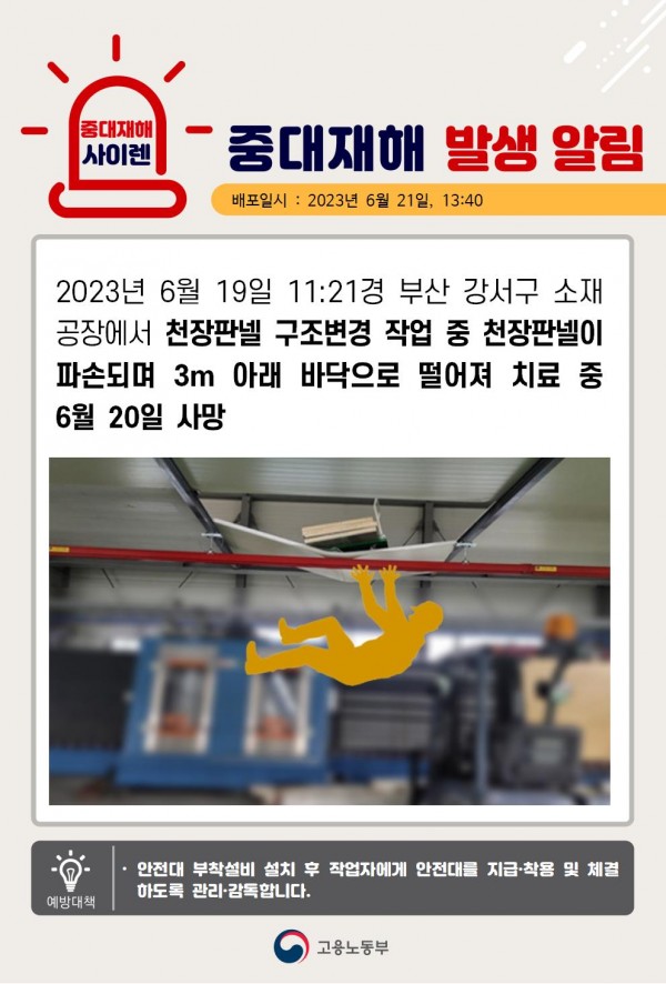 <중대재해>천장판넬 구조변경 작업 중 떨어짐 페이지 정보 작성자 안전경영컨설팅 작성일23-08-31 16:43 조회4,128회 댓글0건 관련링크 이전글 다음글 목록 본문 . 댓글목록 등록된 댓글이 없습니다. 이전글 다음글 목록