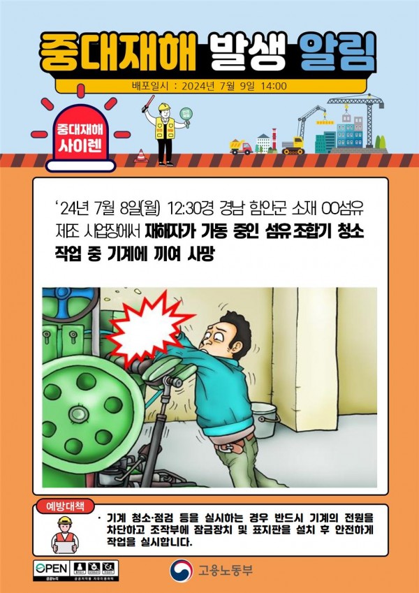 섬유제조 사업장에서 섬유조합기 청소 중 끼임 사망 페이지 정보 작성자 안전경영컨설팅 작성일24-07-17 23:16 조회3,610회 댓글0건 관련링크 이전글 다음글 목록 본문 . 댓글목록 등록된 댓글이 없습니다. 이전글 다음글 목록