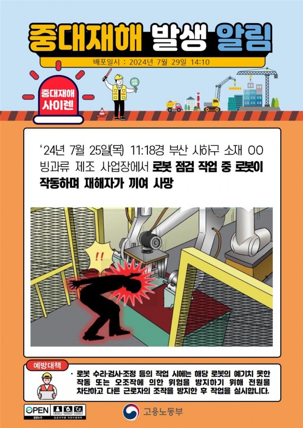 빙과류 제조 사업장 로봇 점검 중 끼임 사망 페이지 정보 작성자 안전경영컨설팅 작성일24-07-30 09:21 조회3,612회 댓글0건 관련링크 이전글 다음글 목록 본문 . 댓글목록 등록된 댓글이 없습니다. 이전글 다음글 목록